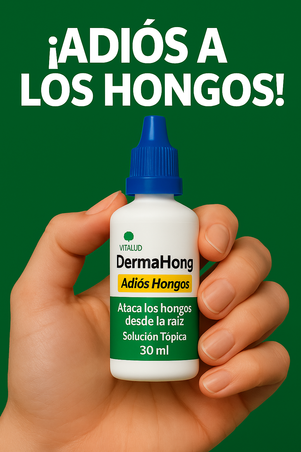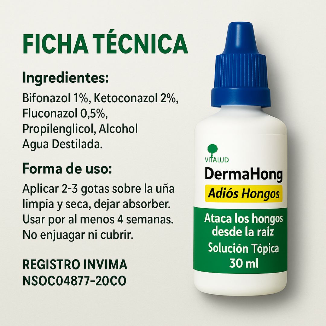 👉 DermaHong es una solución tópica en gotero de 30 ml, diseñada especialmente para tratar hongos en las uñas de manos y pies. Ayuda a eliminar el hongo desde la raíz y promueve la recuperación natural de la uña.